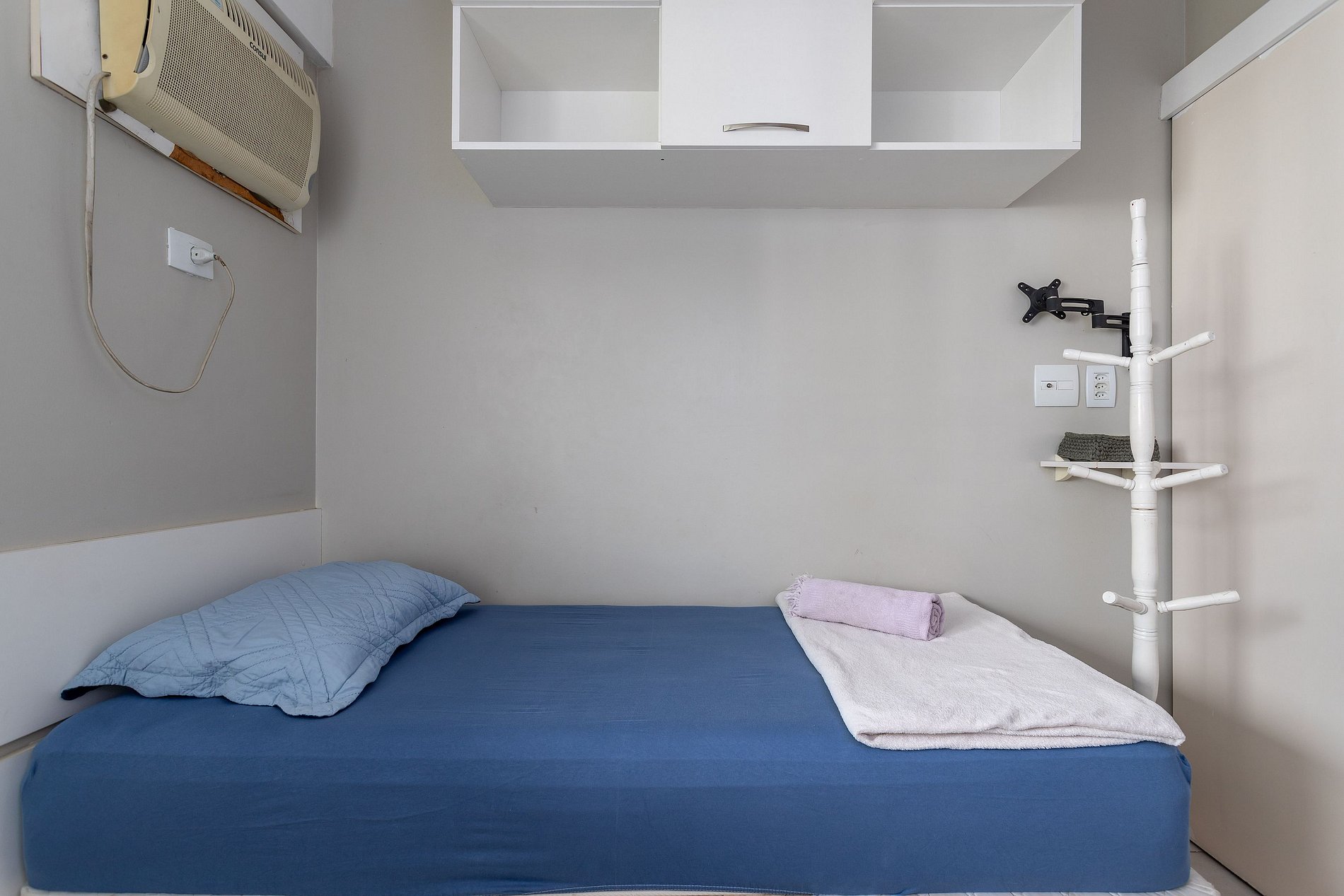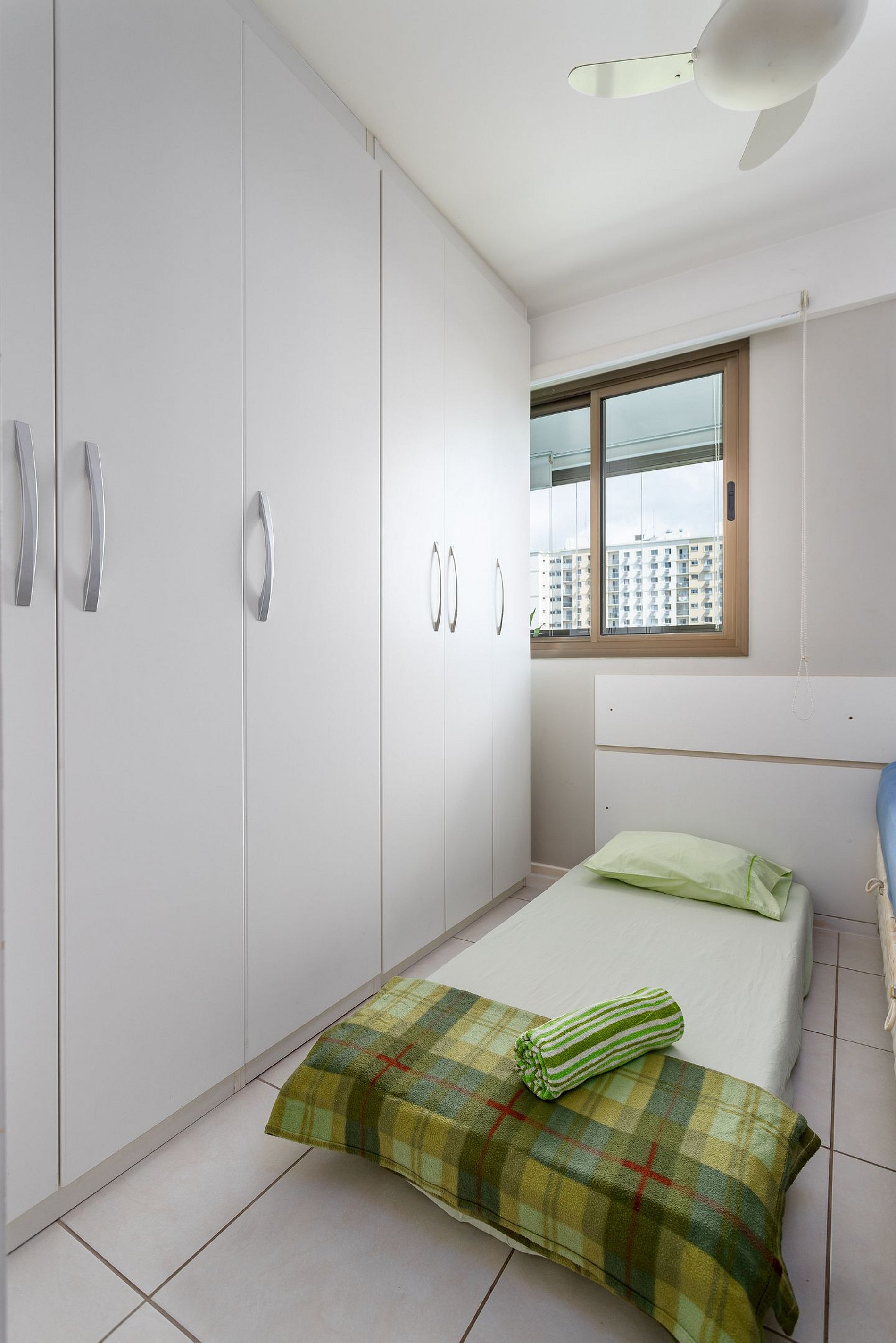 Quarto 2: Uma cama de solteiro com uma cama auxiliar e colchonete extra, ventilador de teto, guarda roupa e cabideiro.