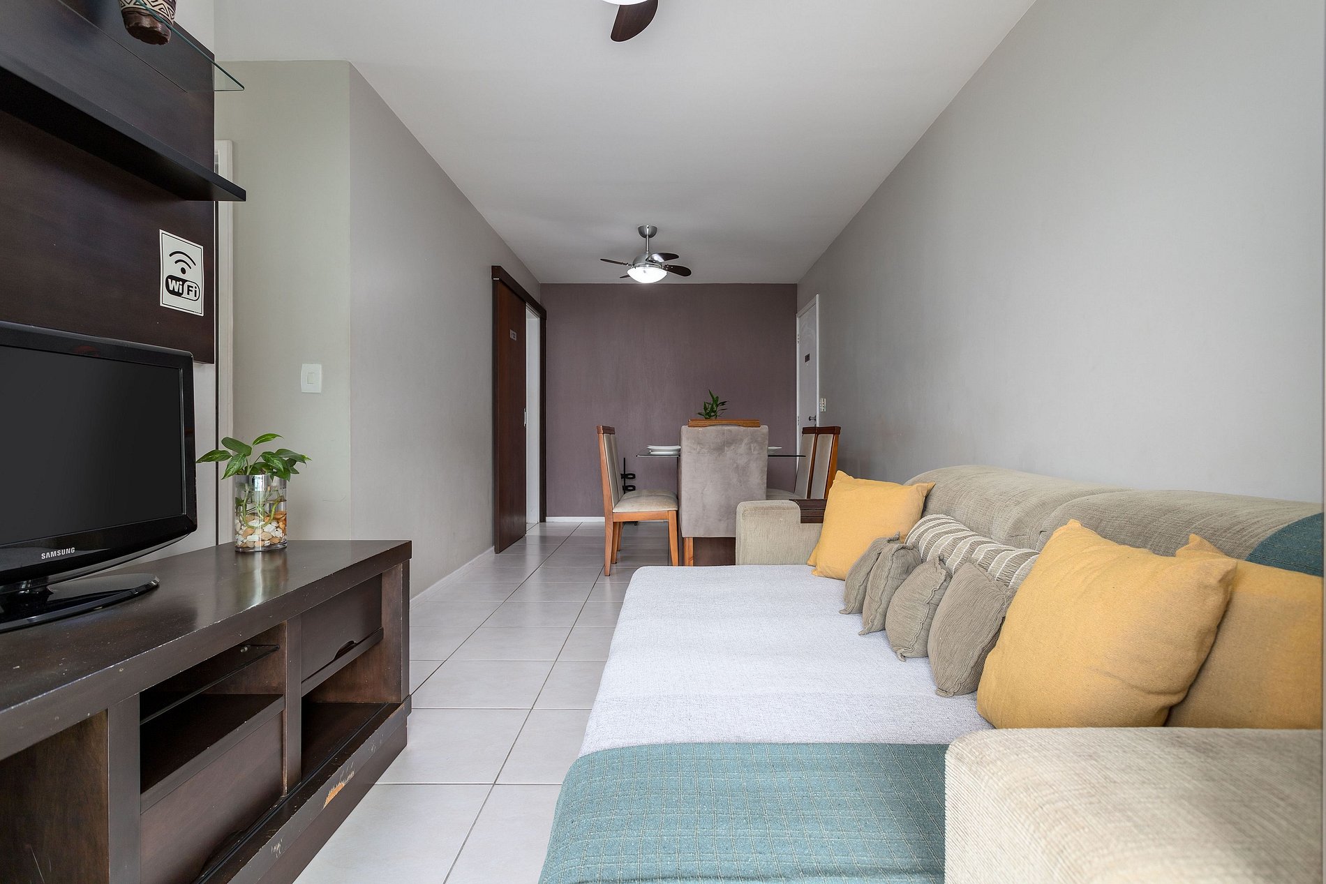 Sala: Um sofá expansível, é possível dormir nele, mesa para 6 pessoas, um puff branco, um rack com TV 32" com todos os canais abertos e a cabo, internet WiFi , 2 ventiladores de teto (área de jantar e área de TV).