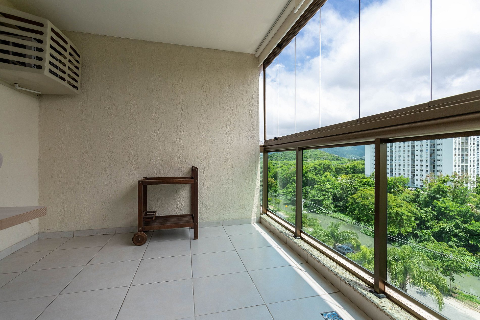Varanda: Ampla, com cortina de vidro, ventilador de teto e uma mesa para uso do computador pessoal dos hóspedes.