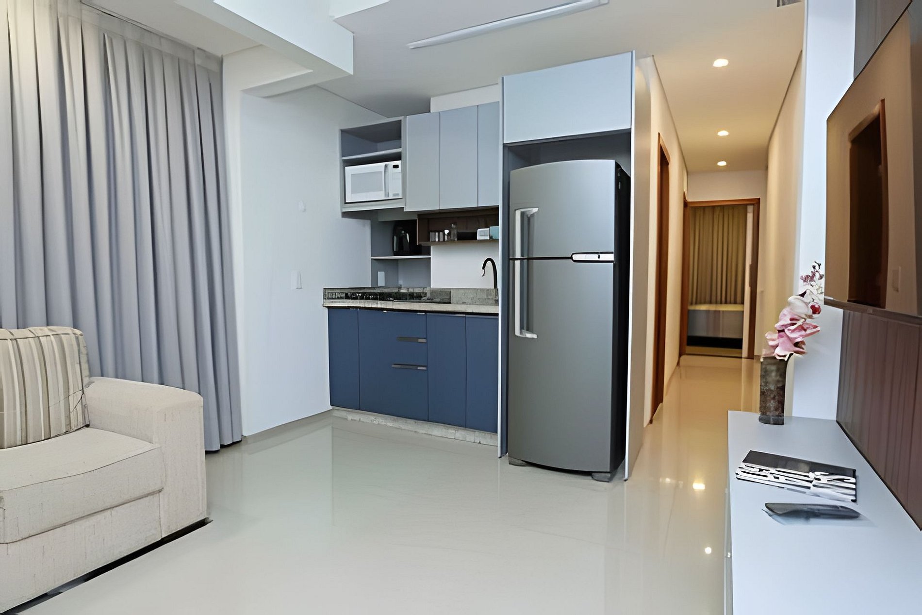 A sala conta com uma TV Smart 43", tendo a cozinha integrada e totalmente equipada para atender os amantes da culinária que desejam experimentar pratos locais ou preparar suas refeições favoritas (alguns dos eletrodomésticos são air fryer, chaleira elétrica, microondas, sanduicheira ).