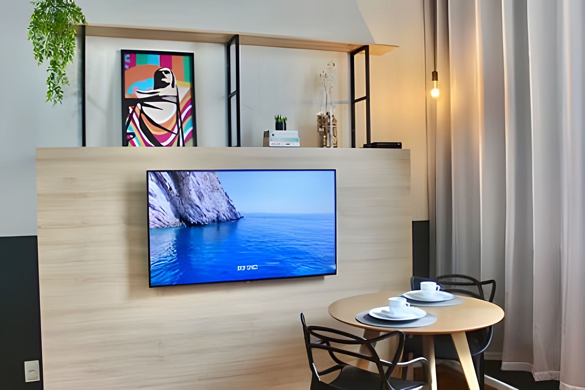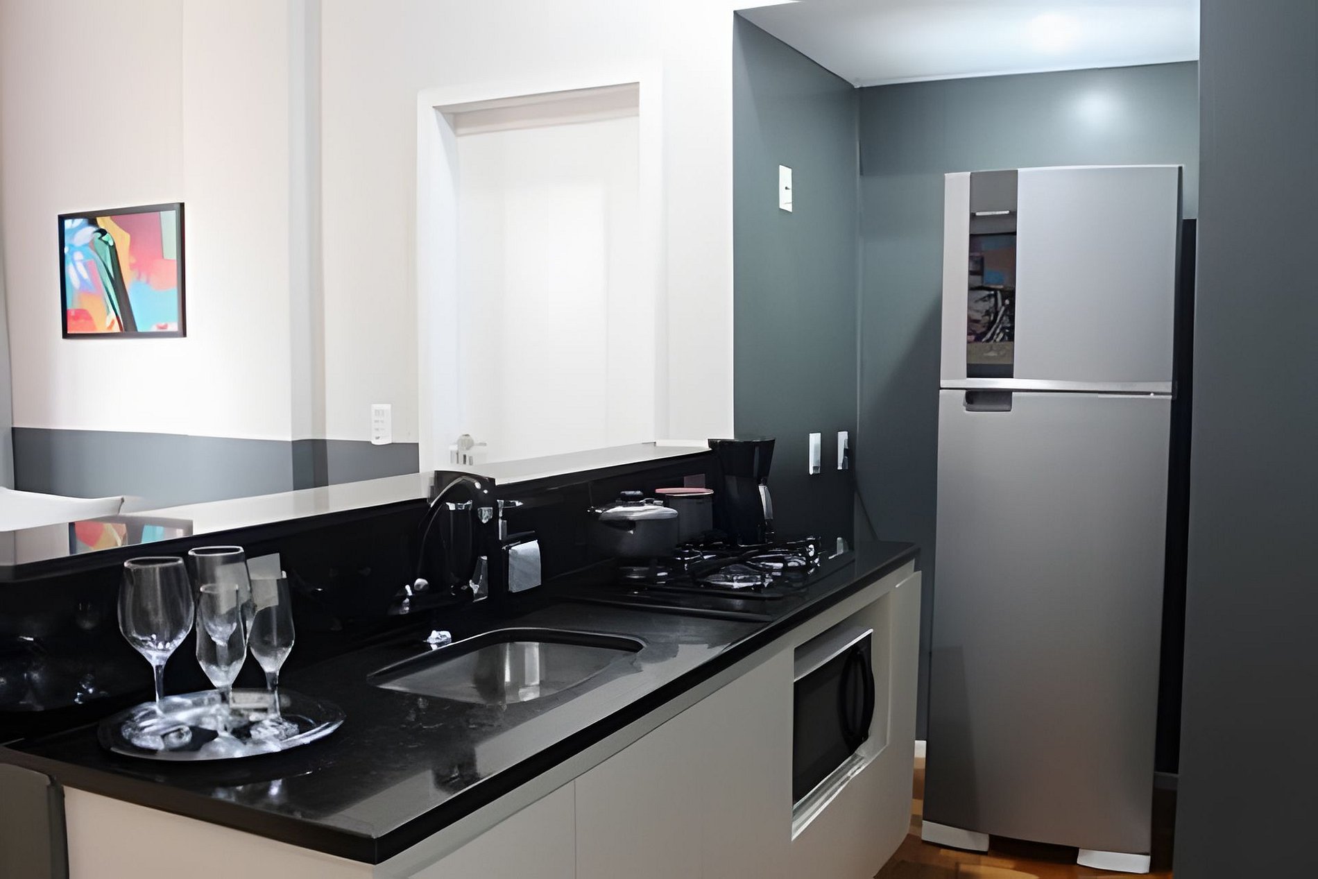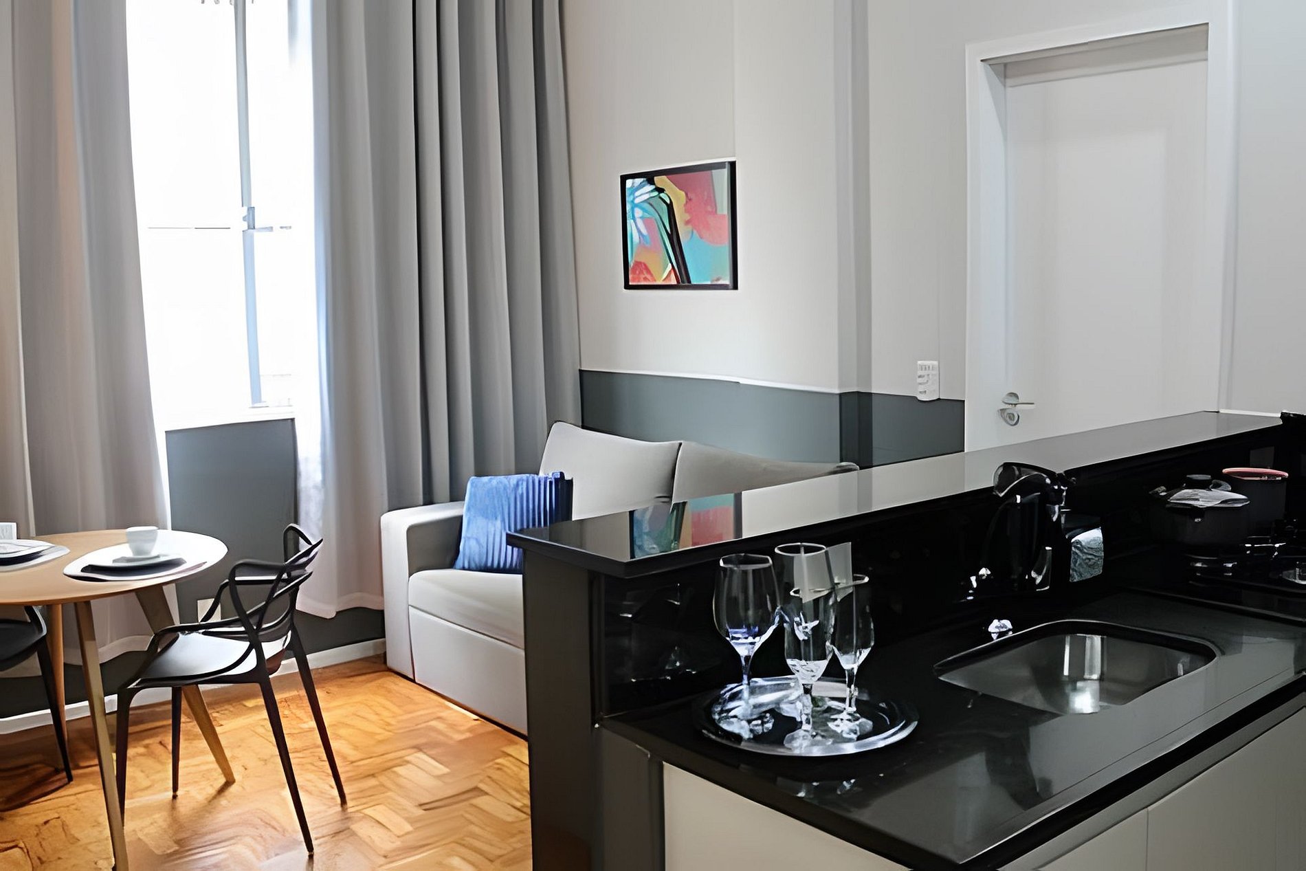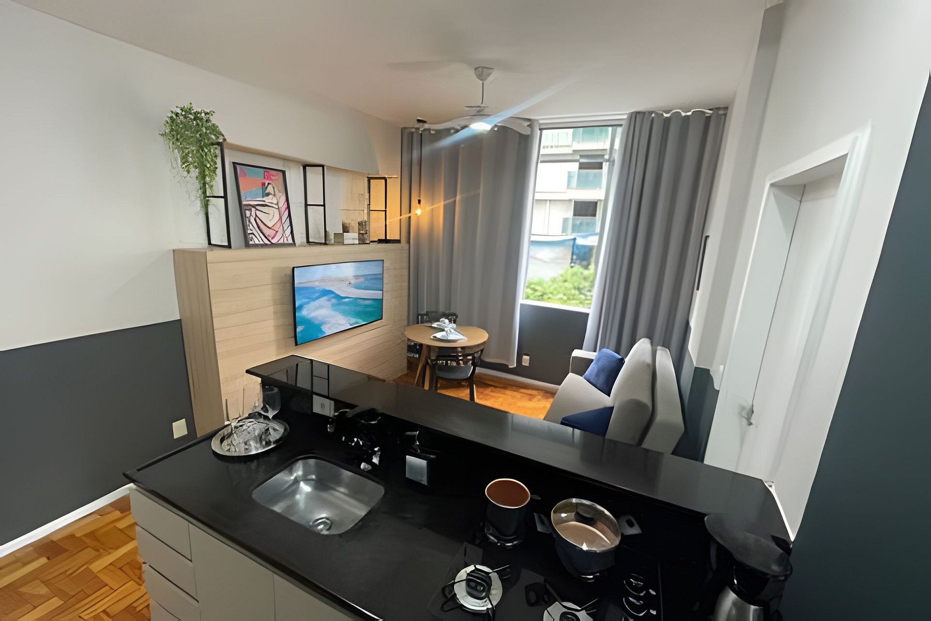 O apartamento possui 1 quarto com uma cama queen, lençóis, toalhas e ar condicionado com temperatura de até 18 graus na suíte e 1 sala com um sofá-cama, mesa com quatro cadeiras, televisão, Wi-fi. Temos ventiladores de teto na sala e no quarto. Também possui 1 cozinha completamente mobilada com geladeira, fogão, microondas, liquidificador, sanduicheira e cafeteira. Nos armários tem os utensílios de cozinha para uso. A cozinha em estilo americano possui uma bancada para acomodar os hóspedes. O apartamento possui janelas enormes na sala e no quarto separados, com aberturas para desfrutar da vista para o Cristo Redentor e para o mar! É muito perto de bancos, farmácias, supermercados, restaurantes, padarias, lanchonetes e lojas em geral. Há porteiros 24 horas por dia. O prédio tem elevadores e câmeras de segurança.